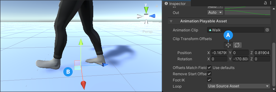 # Animate a humanoid This workflow demonstrates how to use a Timeline instance to animate a humanoid model so that it turns left and begins to walk. Although this workflow uses a humanoid, you can use this animation method for any GameObject. This workflow uses the humanoid model named `DefaultMale` and animation source assets from the [Gameplay Sequence sample](samp-gameplay-demo.md) for its examples. Consult [Timeline Samples](samp-overview.md) for information on the samples available from the Timeline package and how to import these samples into your projects. This workflow starts with a Timeline instance that has an empty Animation track bound to the `DefaultMale` humanoid model. ![](images/tl-human-start.png) _The `DefaultMale` humanoid model linked to a Timeline instance (`HumanTL`) with an empty Animation track bound to the same model_ While animating the humanoid model, this workflow demonstrates how to do the following: 1. [Add and position Animation clips](#addclips). 1. [Match clip offsets](#matchclips). 1. [Create blends between clips](#blendclips). 1. [Manually adjust clip offsets to reduce foot sliding](#reduceslide). ## Add and position Animation clips 1. From your Project, drag an animation source asset into the Animation track to add a new Animation clip. Dragging a source asset adds an Animation clip on the same track. The duration of the Animation clip matches the source asset. 1. To position, resize, or trim the Animation clip in the Content view, select **Mix mode** as the Edit mode. There are [three Edit modes](clip-overview.md) that affect the editing behavior of the Timeline window. When the Timeline window is in **Mix mode**, you can drag to position, trim, and blend clips. You can also select an Animation clip to modify its [Animation clip properties](insp-clip-anim.md), including its Start, End, and Duration, in the Inspector window. ![](images/tl-mix-mode-turnleft-clip.png) _The Mix mode (red) is the selected Edit mode. The `TurnLeft` clip is positioned to start at frame 0._ 1. Add a second Animation clip. This workflow adds a walk clip (`Walk`), positions the clip so it starts immediately after the first clip, and it resizes the second clip to include one loop. ![](images/tl-human-all-clips.png) _Animation track with the `TurnLeft` and `Walk` Animation clips_ 1. Play the Timeline instance. In this example, the `DefaultMale` animation jumps between each Animation clip because its position and rotation at the end of each clip does not match the position and rotation at the start of the next Animation clip. ![](images/spec-human-before-match.png) _The `DefaultMale` jumps between the `TurnLeft` Animation clip, which ends at frame 105 (A), and the `Walk` Animation clip, ghost model which starts at frame 106 (B)_ ## Match clip offsets To fix animation jumping between clips, match the offset of each Animation clip. The Timeline window provides [different methods for matching offsets](clip-match.md). This workflow demonstrates how to match an Animation clip with the previous clip. In this workflow, to match the TurnLeft clip with the previous clip, follow these steps: 1. Select the TurnLeft clip. 1. Right-click the selected clip and choose **Match Offsets to Previous Clip** from the context menu. The position and rotation of the humanoid at the start of the second Animation clip (`Walk`) matches the position and rotation of the humanoid at the end of the first Animation clip. ![](images/spec-human-after-match.png) _The ghosted `DefaultMale` at the start of the `Walk` Animation clip, which starts at frame 106 (B), matches the position and rotation of the `DefaultMale` at the end of the `TurnLeft` Animation clip, which ends at frame 105 (A)_ 1. Play the Timeline instance again. Although the position and rotation of the humanoid matches, there is still a jump between the two Animation clips because the humanoid is in different poses: * At the end of the `TurnLeft` Animation clip, the feet are on the ground and the arms are slightly raised. * At the start of the `Walk` Animation clip, the left leg is off the ground and the arms are in a relaxed position. To remove the jump and to transition between these two poses, you can [create a blend](#blendclips). ## Create blends between clips Create a blend to seamlessly mix between two different animations or poses. The Timeline window includes many different ways to [create a blend](clip-blend.md) between Animation clips. To create a blend, move an Animation clip until it overlaps another Animation clip. You might need to adjust the size of the Animation clips, the Blend Area, the Clip In value, and the shape of each Blend Curve to create a smoother transition between the two poses. For example, in the transition between the `TurnLeft` clip and the `Walk` clip, the `Walk` clip was repositioned to start at frame 83. The rest of the clip properties are unchanged from their default values. ![](images/tl-human-blend.png) _Overlap two clips to create a smooth transition between two Animation clips_ As the `TurnLeft` clip transitions to the `Walk` clip, the blend removes the obvious jump between poses. The transition between most body parts appears natural, however in this case, the blend between the different positions of the foot results in an unnatural slide. ## Reduce foot sliding To reduce foot sliding, manually adjust the offset of an Animation clip so that the position of the foot changes less drastically. To manually adjust the offset, follow these steps: 1. Select the Animation clip in the Timeline window and, in the Inspector window, expand **Animation Playable Asset**. ![](images/insp-clip-anim-playable-walk.png) _The **Animation Playable Asset** properties include the **Clip Transform Offsets**_ In this example, the X Position. Z Position, and Y Rotation of the **Clip Transform Offsets** for the Walk Animation clip is not zero because a **Match Offsets to Previous Clip** was performed earlier in this workflow. Match to a 