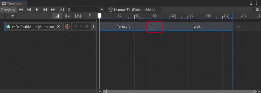 DefaultMaleat the start of theWalkAnimation clip, which starts at frame 106 (B), matches the position and rotation of theDefaultMaleat the end of theTurnLeftAnimation clip, which ends at frame 105 (A) -