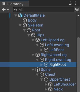 1. In the Scene Hierarchy, navigate and choose RightFoot in the DefaultMale character hierarchy.