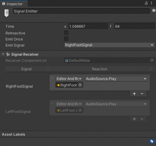 In this step, for the additional footsteps, you reuse each created Signal Asset based on which foot touches the floor. This is similar to adding a marker and signal in the previous steps.