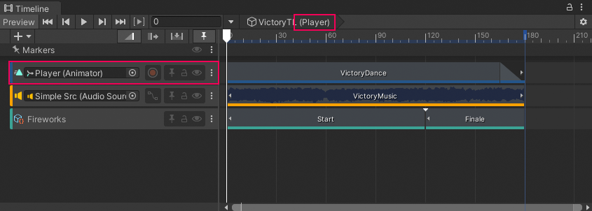 For example, you could create a Timeline asset named VictoryTL with the animation, music, and particle effects that play when the main game character (Player) wins. To reuse the VictoryTL Timeline asset to animate another game character (Enemy) in the same Scene, you can create another Timeline instance for the secondary game character.